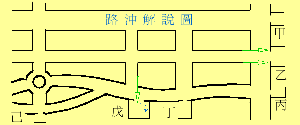 戊商店跟丁商店的情形一樣,前面有一條短的路直沖而來,但是戊商店並 不直接對著前面的路,而是有點偏移,這使得路的邊緣(綠色箭頭)直指著店門,這樣的情形是絕對不行的,一定要改掉。圖中顯示改掉過的情形,做兩道成直角的牆,進去的人必須轉九十度角,那麼前面來路的力量就減弱了。只要門前有不可避免的煞氣,一律使用這個方法來避掉。但請記得,不要只做一面牆而使得人可以選擇從左邊或從右邊進來,只能使用一邊,左邊或右邊都可以。